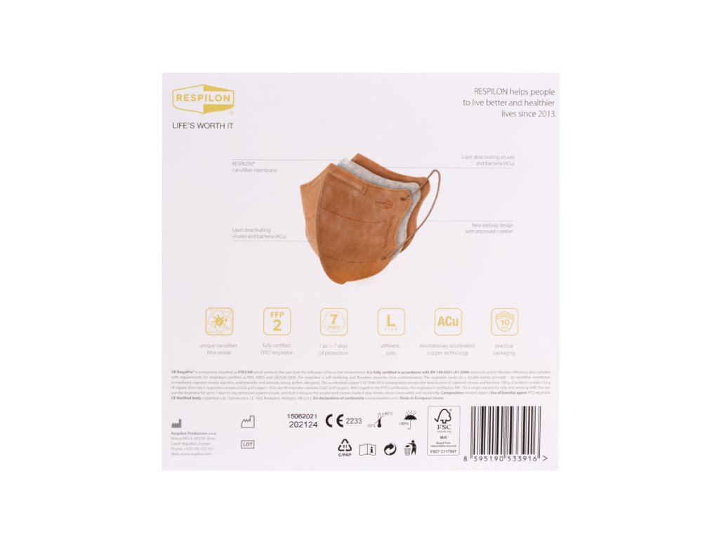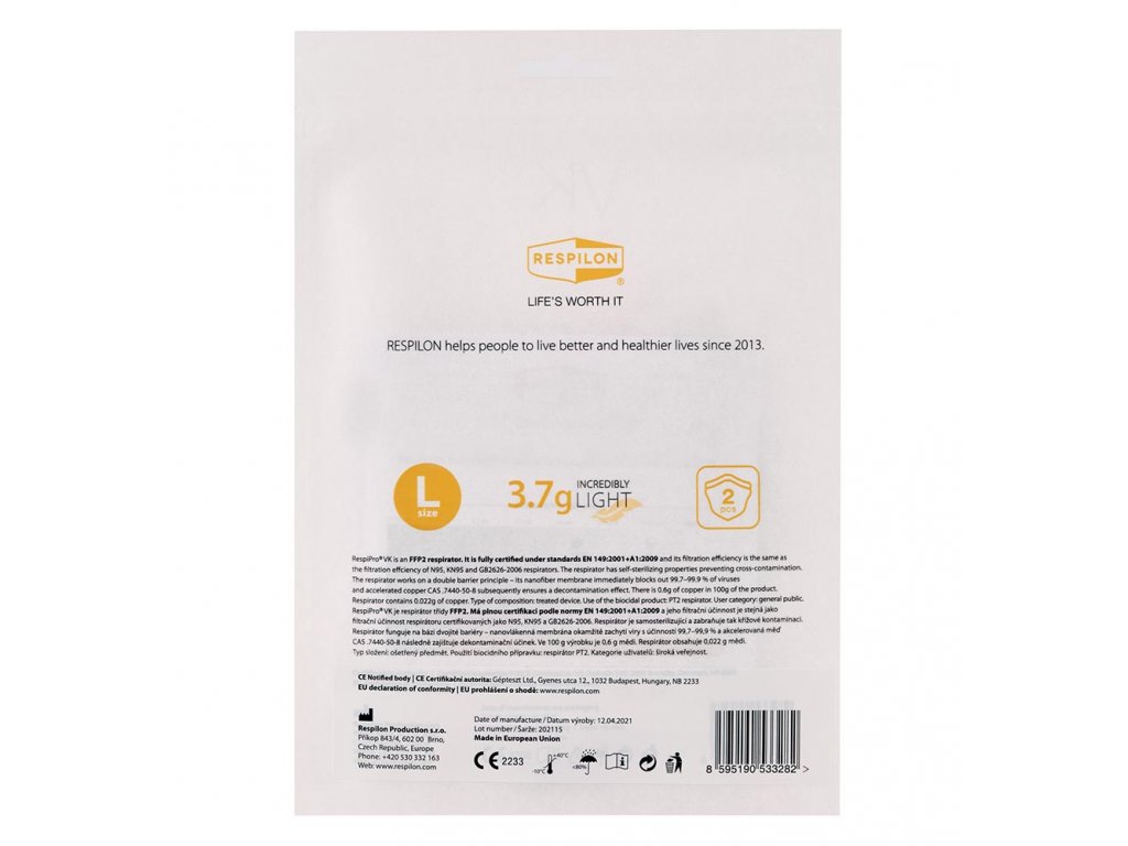 Die Nanofaser-Atemschutzmaske VK RespiPro der zweiten Generation ist eine Atemschutzmaske der Klasse FFP2 NR, die ihre Benutzer vor dem Einfluss schädlicher Krankheitserreger aus der nahen Umgebung schützt. Sie ist vollständig gemäß der Norm EN 149:2001+A1:2009 zertifiziert.